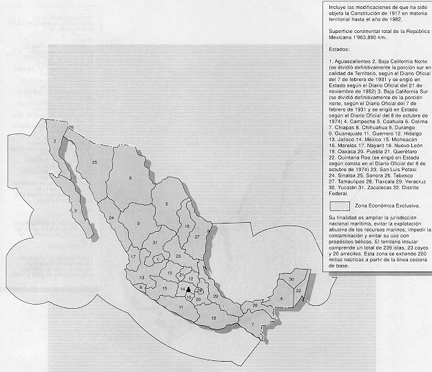State borders as of 1982 with Quintana Roo and Baja California Sur as states and demarcating exclusive maritime economic zone.